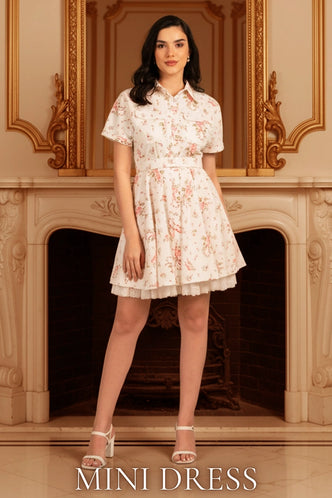 Ivory Floral Lace-Panel Belted Shirt Midi Dress
