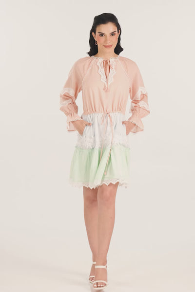 Pastel Peach Lace Trim Tiered Mini Dress