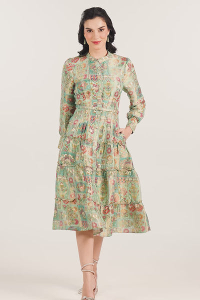 The Sage Boho Green Jacquard Floral Belted Midi Dress blends timeless elegance with bohemian spirit. Crafted from 100% silk jacquard with cotton lining, this breathable and luxurious midi dress brings comfort and sophistication to every occasion. Its sage green palette and floral printed jacquard texture make it one of the most versatile dresses for women — equally suited for formal events, casual outings, or special evenings. A refined one piece dress, it belongs in every curated dresses for women online collection, proving that dresses are perfect when designed with style, quality, and intention.