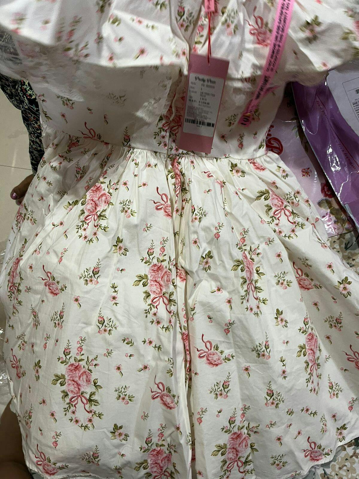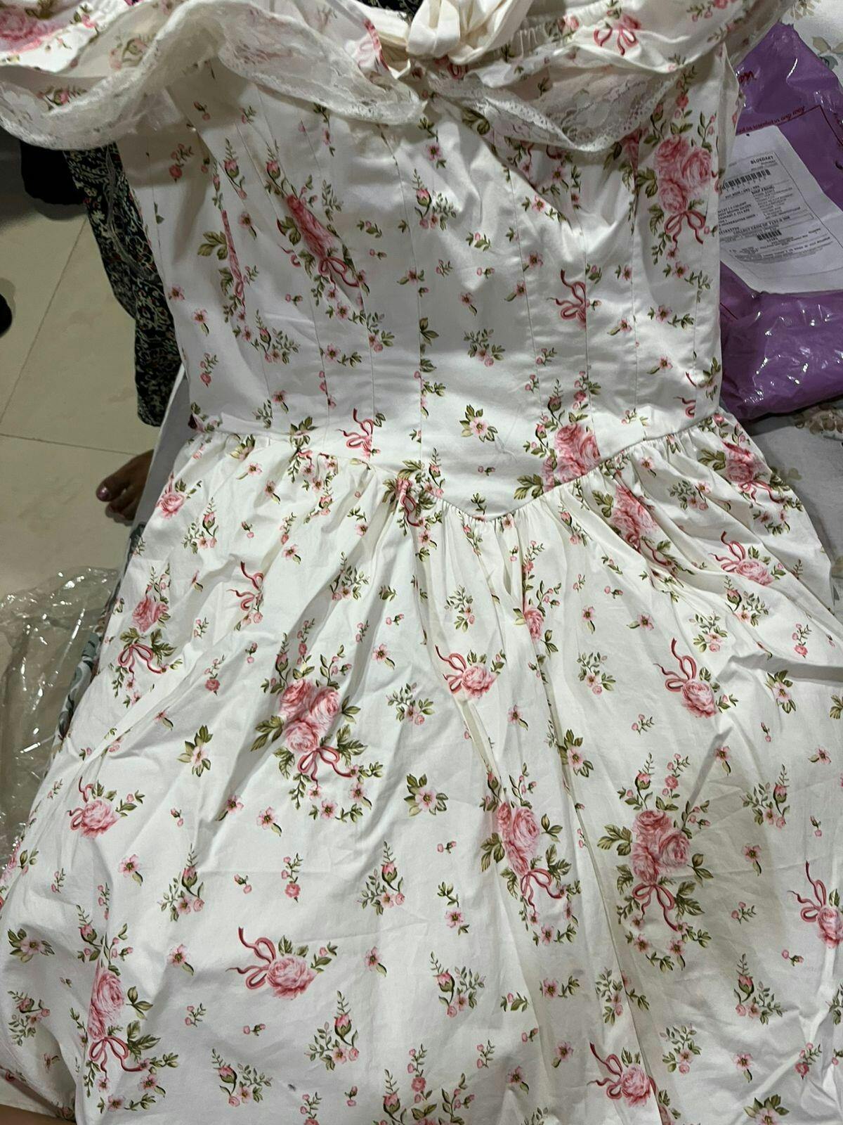 The flared skirt and fitted bodice shape the waist and move with grace. A delicate floral print blooms across an ivory base, flattering every body type while adding just the right amount of charm.