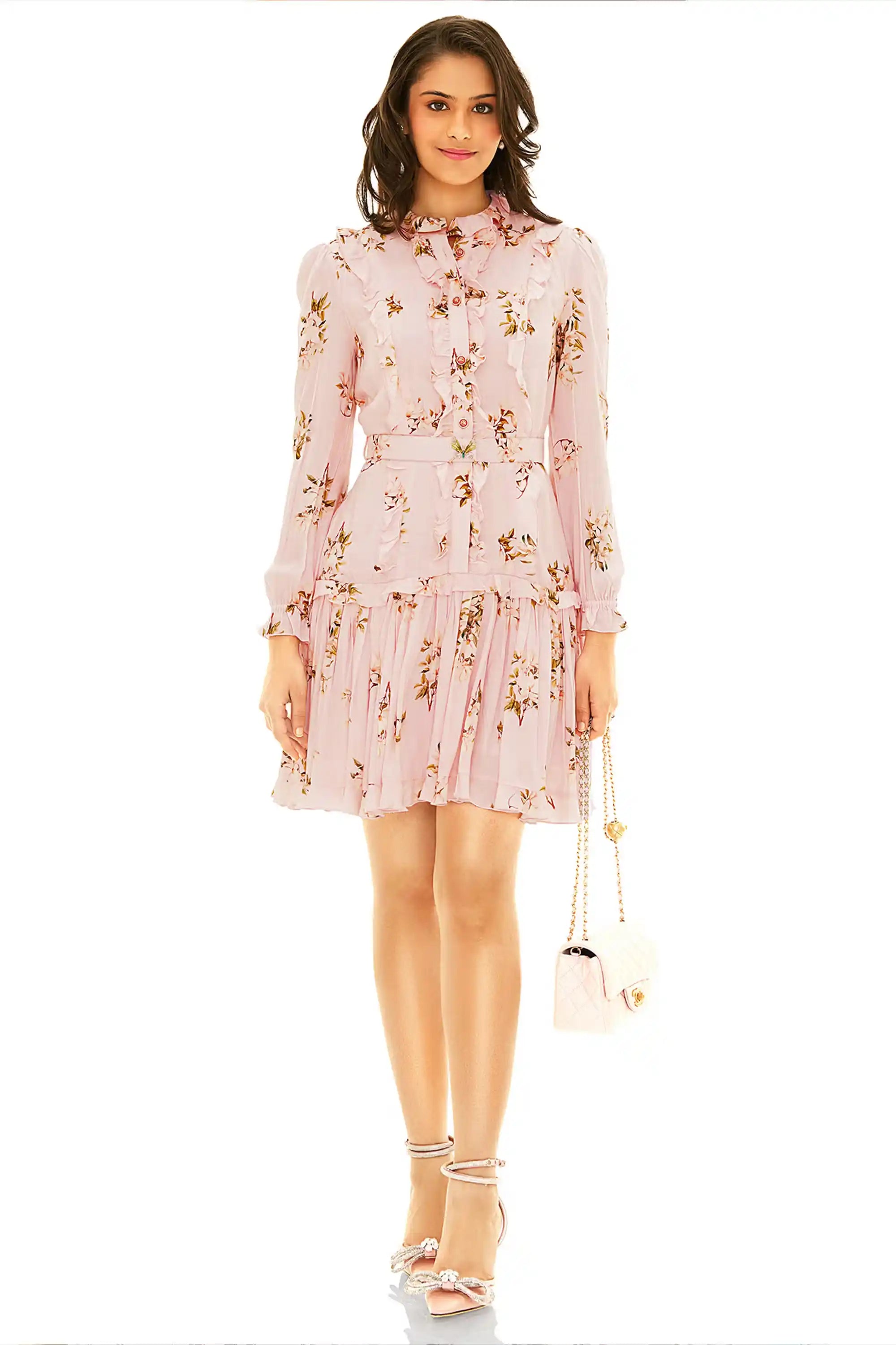 Hannah Ruffled Pink Floral Belted Mini Dress