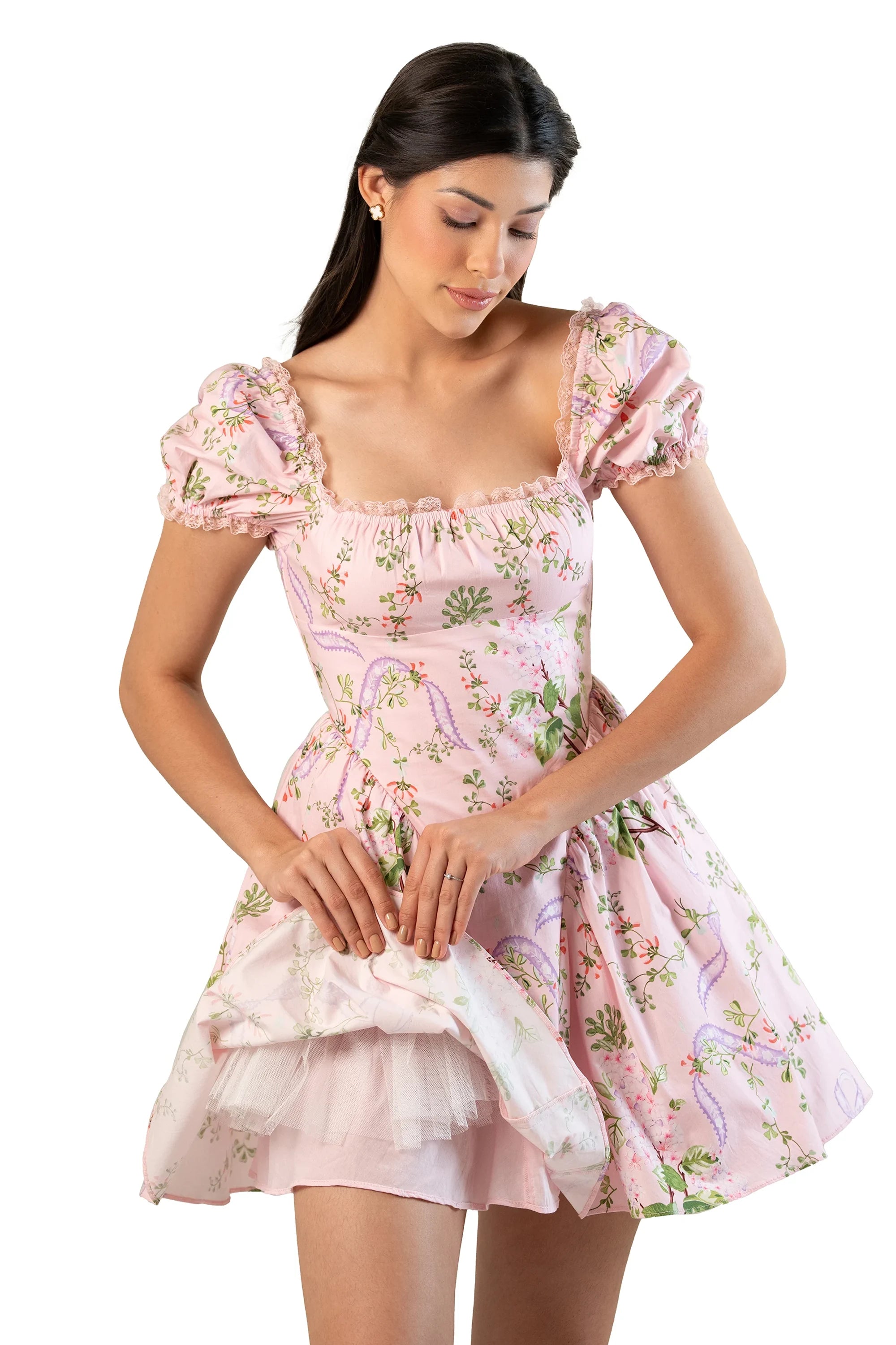 Step into storybook elegance with our Pink Puff Sleeve Floral Mini Dress — a feminine mini dress that adds a touch of magic to sunny days and special outings. This one piece dress features a romantic square neckline, soft puff sleeves trimmed in lace, and a flared silhouette that enhances a range of body types. It's one of those versatile dresses for women that bridges charm and sophistication effortlessly.